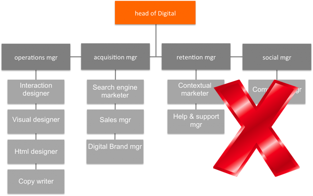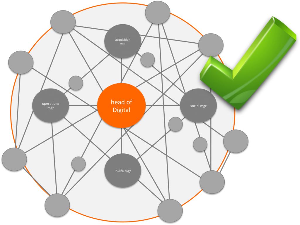 In order to digitalise and organisation it needs to permeate the ‘digital mindset’ throughout the company. This is mostly a bottom-up transformation. Every department needs to revision their strategy to connect to their digital products & services (both internal and external when customer facing). Those companies with a digital division can, however, lead this process by experimenting and evangelising best-practice. New ways of collaboration, communication and defining performance are key.